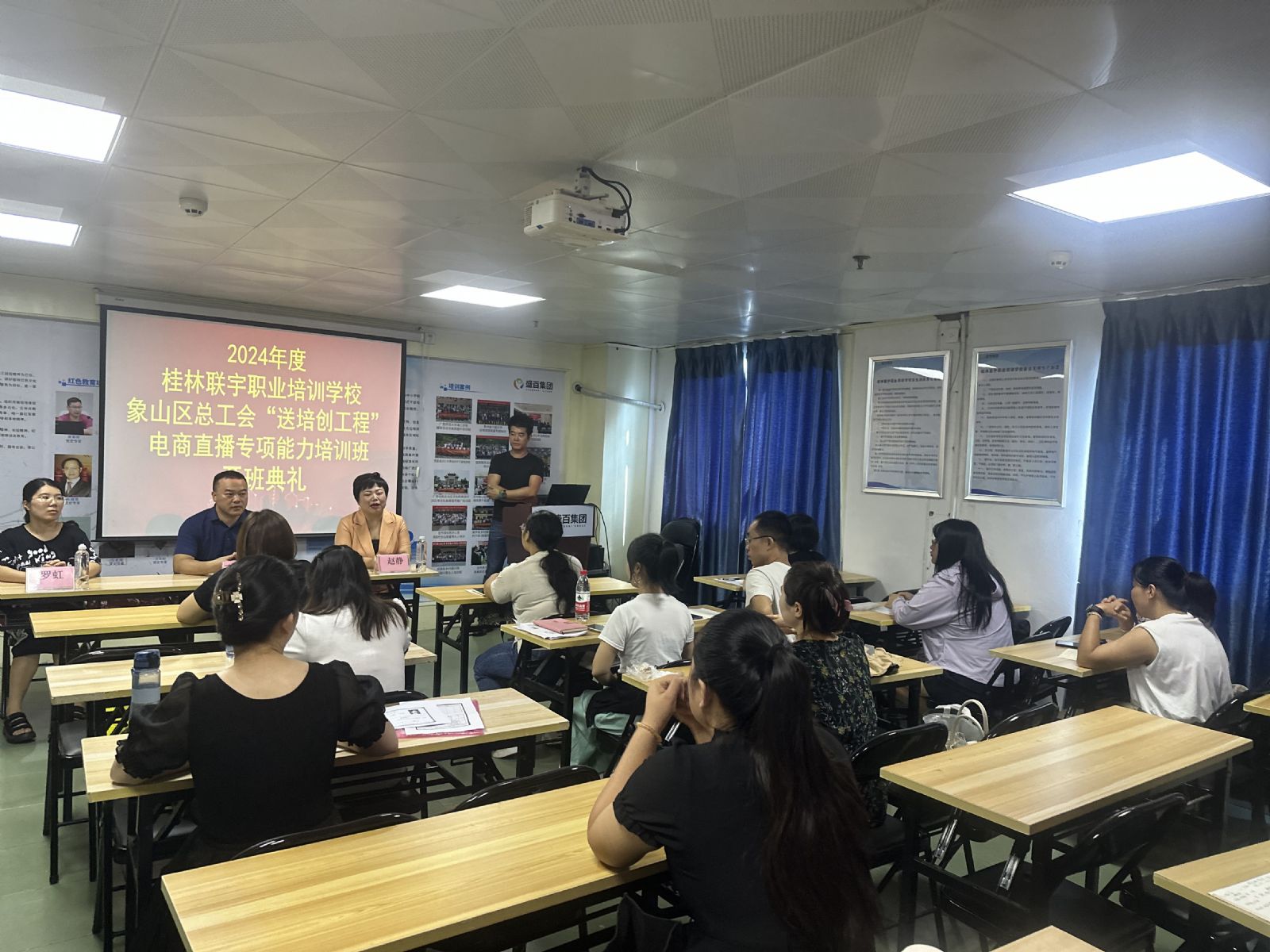 为更好发挥工会培训阵地作用,提升象山区职工(农民工)职业技能,增强技能培训实效性,进一步助力乡村振兴战略,提高和拓宽群众的就业渠道,8月26日,由象山区总工会主办、桂林联宇职业培训学校承办的2024年“送创培工程”电商直播技能培训班在桃园大厦八楼教室正式开班,象山区总工会常务副主席李春喜、干事罗虹及19名学员参加了开班典礼。