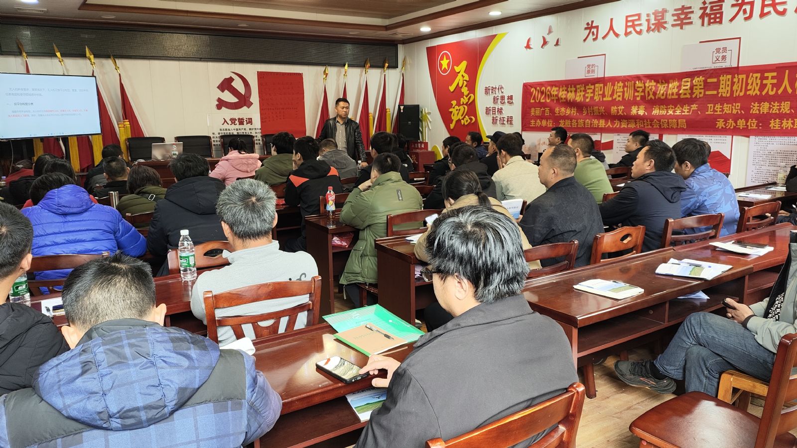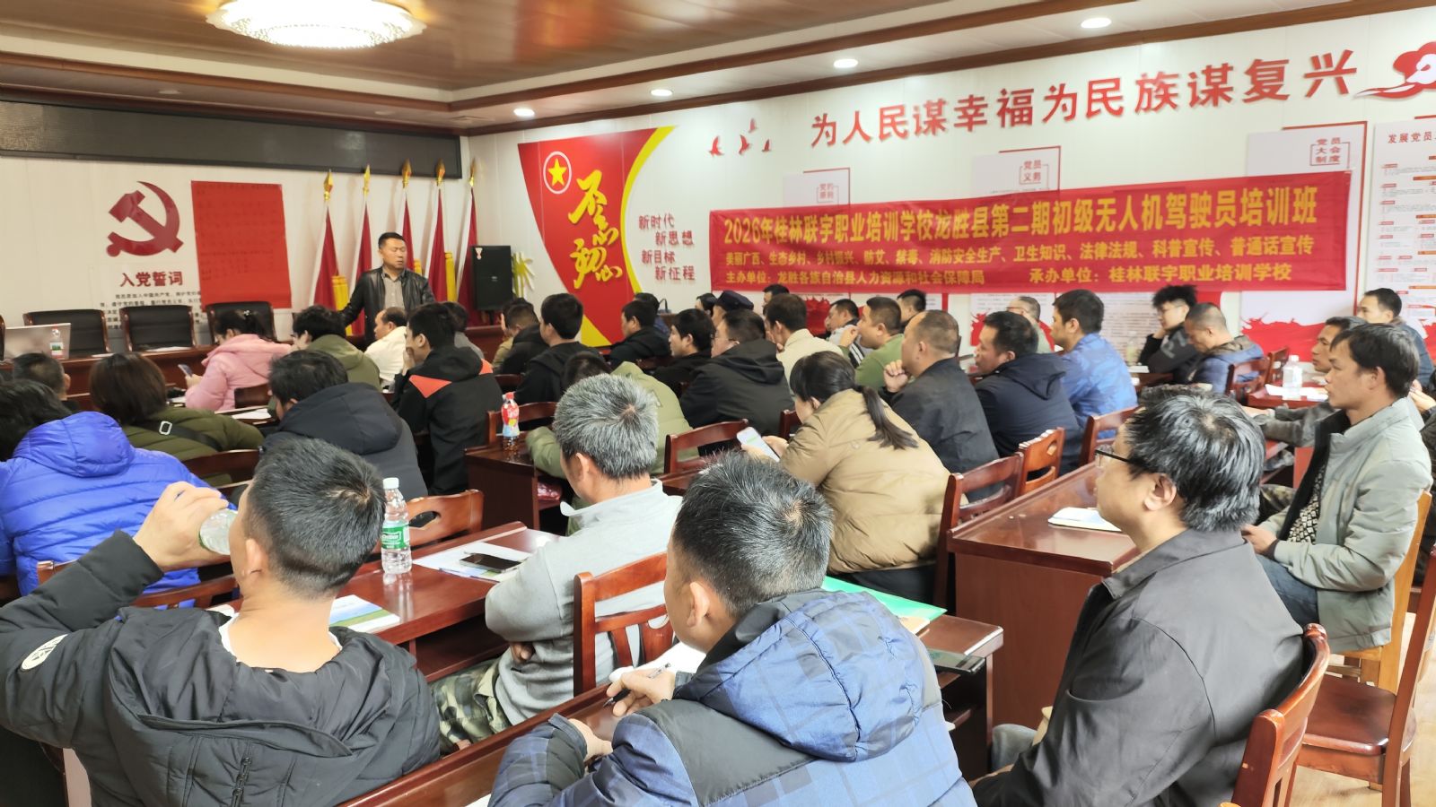 3月22日,由龙胜县人力资源和社会保障局主办、桂林联宇职业培训学校承办的2026年龙胜县第二期无人机驾驶员政府补贴培训班在泗水镇正式开班。本期培训为期八天,第九天组织考试,考试合格者将获得国家认可的无人机驾驶员初级技能证书。培训面向广西农村户口人员和失业人员免费开放,旨在深入推进"技能照亮前程"培训行动,将优质培训资源下沉基层,培养高素质无人机操作人才,切实提升农村群众就业竞争力。