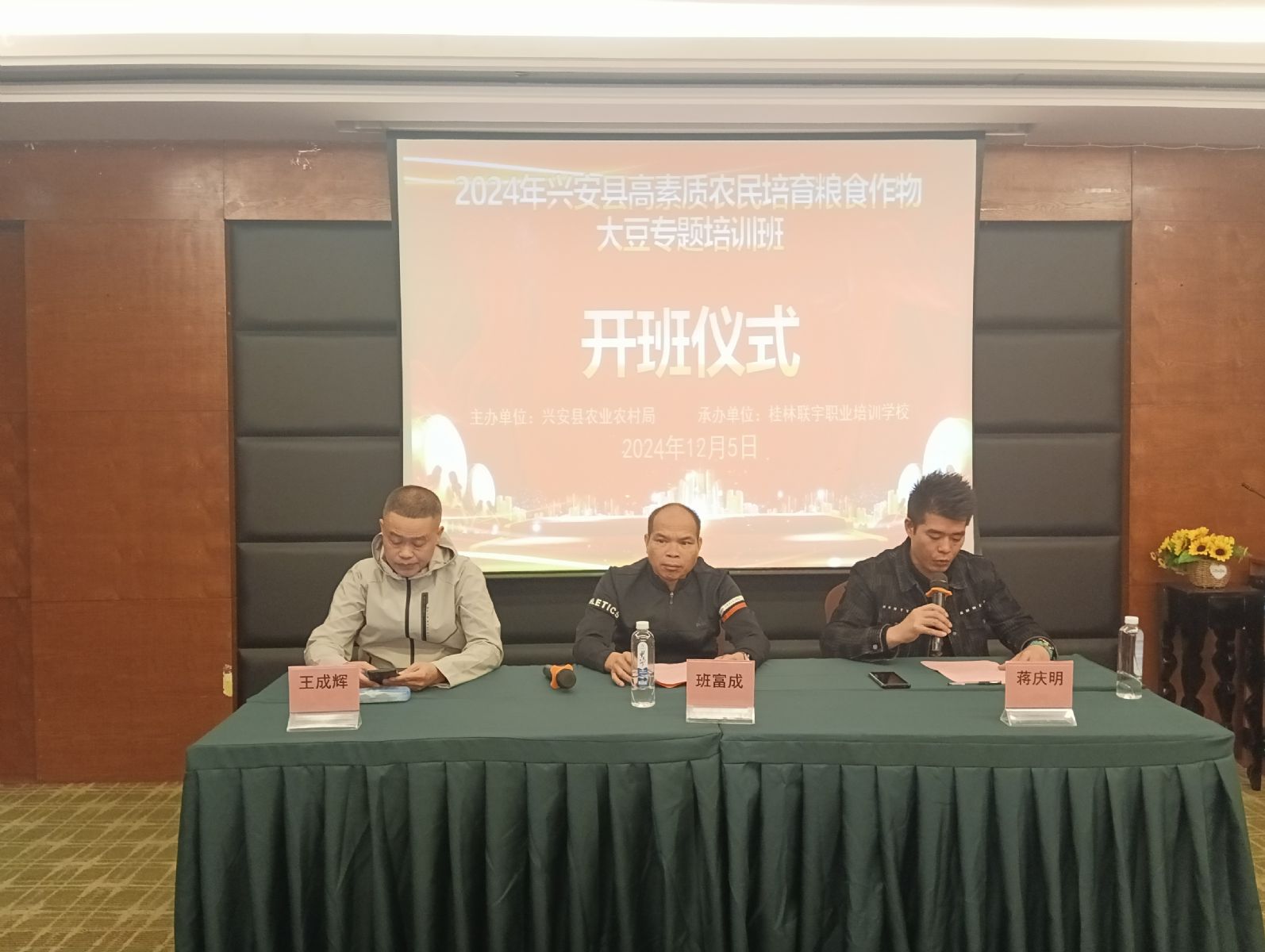 在振兴战略的引领下,为积极响应国家关于加强农业人才培养、推动农业高质量发展的号召,由兴安县农业农村局、桂林联宇职业培训学校精心筹备的“兴安县2024年高素质农民粮油作物大豆专题培训班”于12月5日在兴安县水汇名都酒店会议室顺利开班。此次培训旨在通过系统化的知识传授与实践操作,培养一批懂技术、善经营、会管理的高素质农民,为大豆产业的蓬勃发展注入新鲜血液。