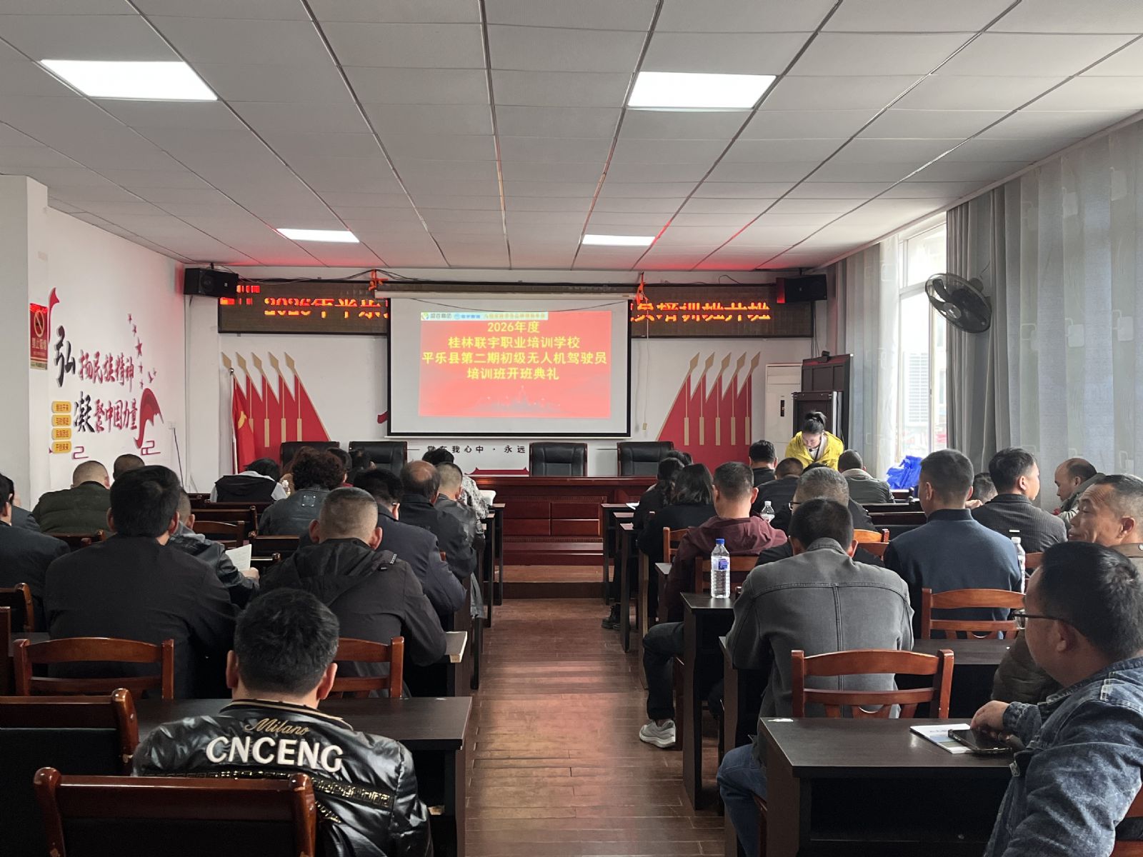 为了培养具备专业资质和实操能力的无人机驾驶员,提升就业竞争力,服务低空经济发展。3月19日,由平乐县人力资源和社会保障局主办、桂林联宇职业培训学校承办的2026年平乐县第二期无人机驾驶员政府补贴培训班正式开班。本期培训面向广西农村户口人员和失业人员免费开放,旨在深入贯彻落实"技能照亮前程"培训行动,抢抓低空经济发展机遇,培养专业飞手人才,切实提高群众就业竞争力,为乡村振兴注入强劲动能。